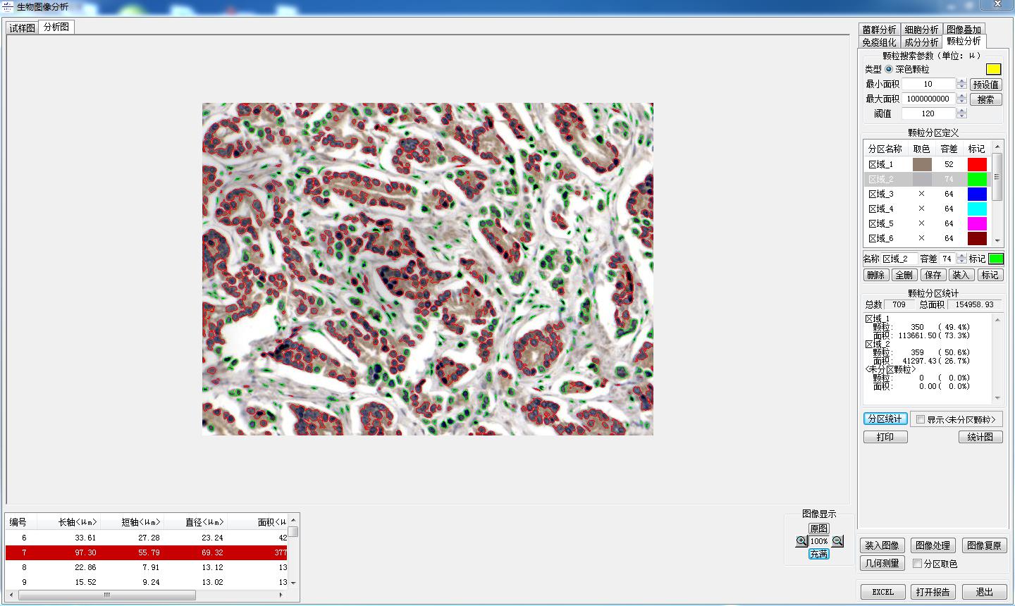 5、顆粒分析:軟件自動提取顆粒,并可設(shè)置區(qū)域,得出每個區(qū)域的顆粒數(shù),面積及百分比。
